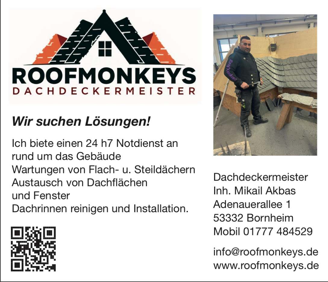 RoofMonkeys Dachdeckermeisterbetrieb in Köln Bonn ist Ihr kompetenter Partner für alle Arbeiten rund ums Dach. Mit unserer langjährigen Erfahrung und unserem qualifizierten Team garantieren wir professionelle Ergebnisse.